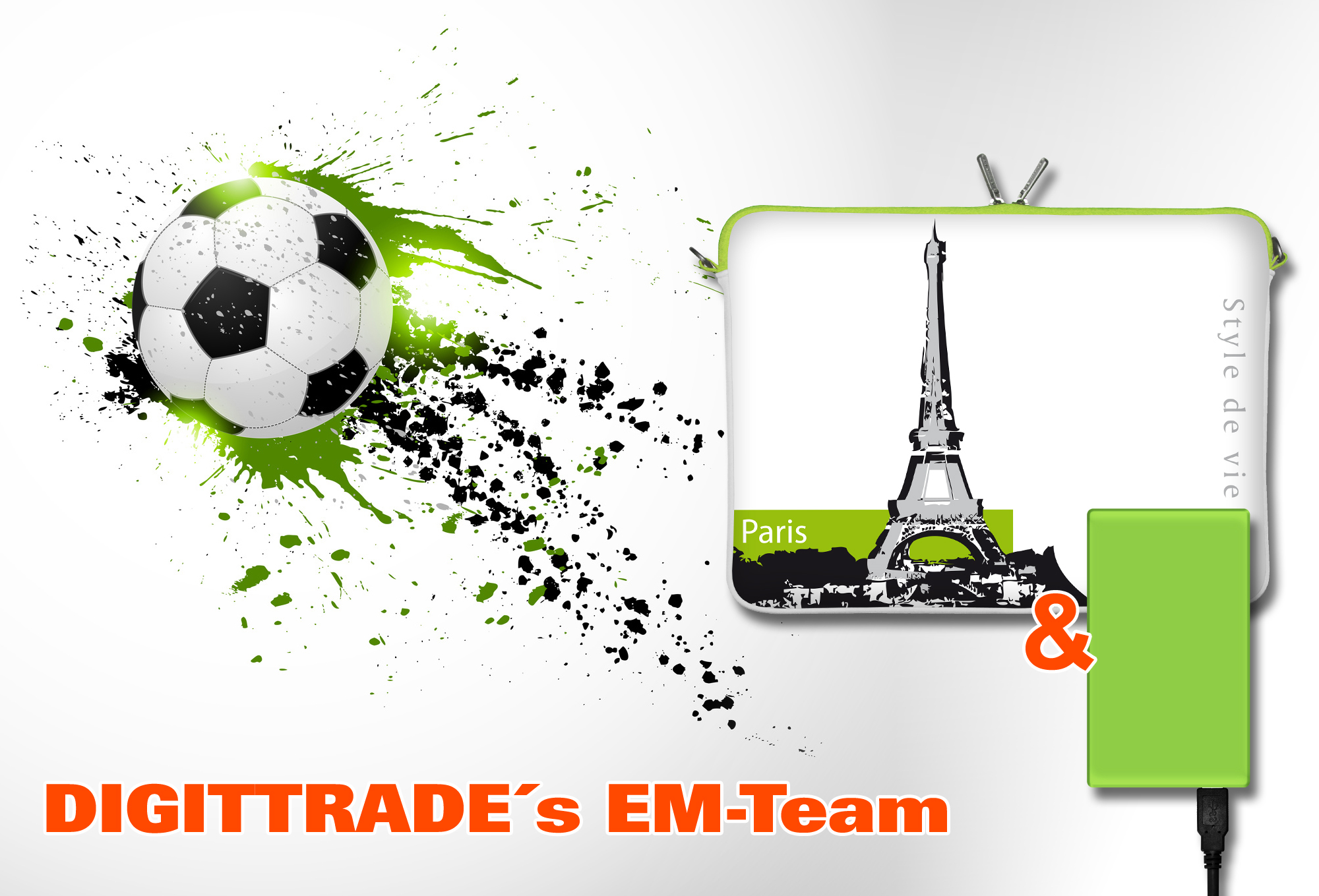 Zum Sport-Event des Jahres möchte DIGITTRADE allen Fußballfans den Weg zum EM-Sieg mit einem speziellen Bundle bestehend aus einem trendigen Laptopsleeve im Eifelturm-Design und einem grasgrünen HipDisk-Gehäuses versüßen. Dieses aufeinander abgestimmte EM-Team verbindet attraktives Design mit ausgeprägter Schutzfunktion für Laptop sowie externer Festplatte und ist zeitgleich ein tolles Andenken an den EM-Sommer 2016.