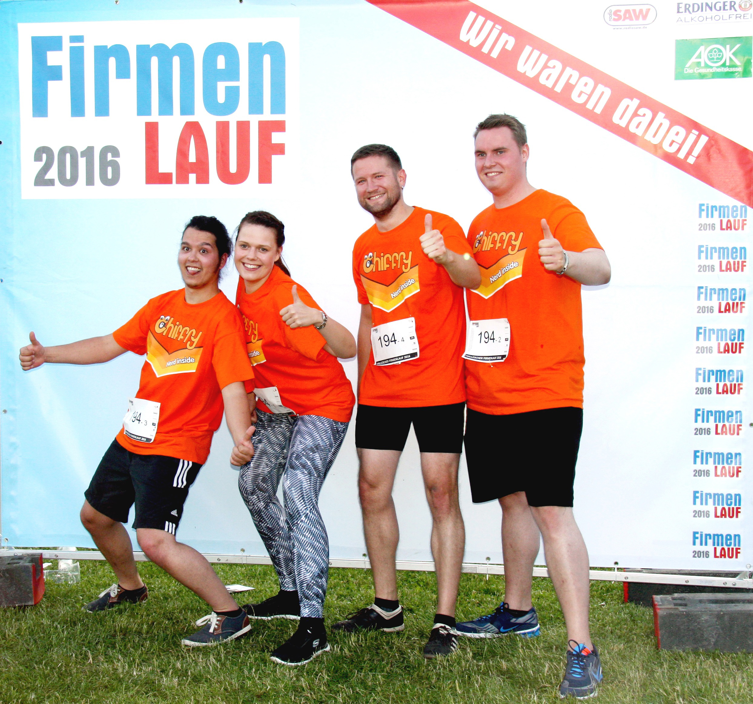 Nicht nur die Nationalelf rennt heute wieder über das Spielfeld der Fußball-Europameisterschaft 2016. Auch ein Chiffry-Team bestehend aus vier Nerds lief gestern am 15. Juni beim 3. Halleschen Firmenlauf über die Ziegelwiese in Halle (Saale). Dabei traten die vier Chiffry-Nerds, wie sich das Team selber nannte, aus Teutschenthal gegen 400 Mannschaften im Staffellauf an. Damit bewiesen sie, dass sie nicht nur datenschutzkonform programmieren sondern auch sportlich sein können. Die zu absolvierende Strecke führte über 2,5 km entlang der Peißnitz und musste von jedem Läufer einzeln gemeistert werden.