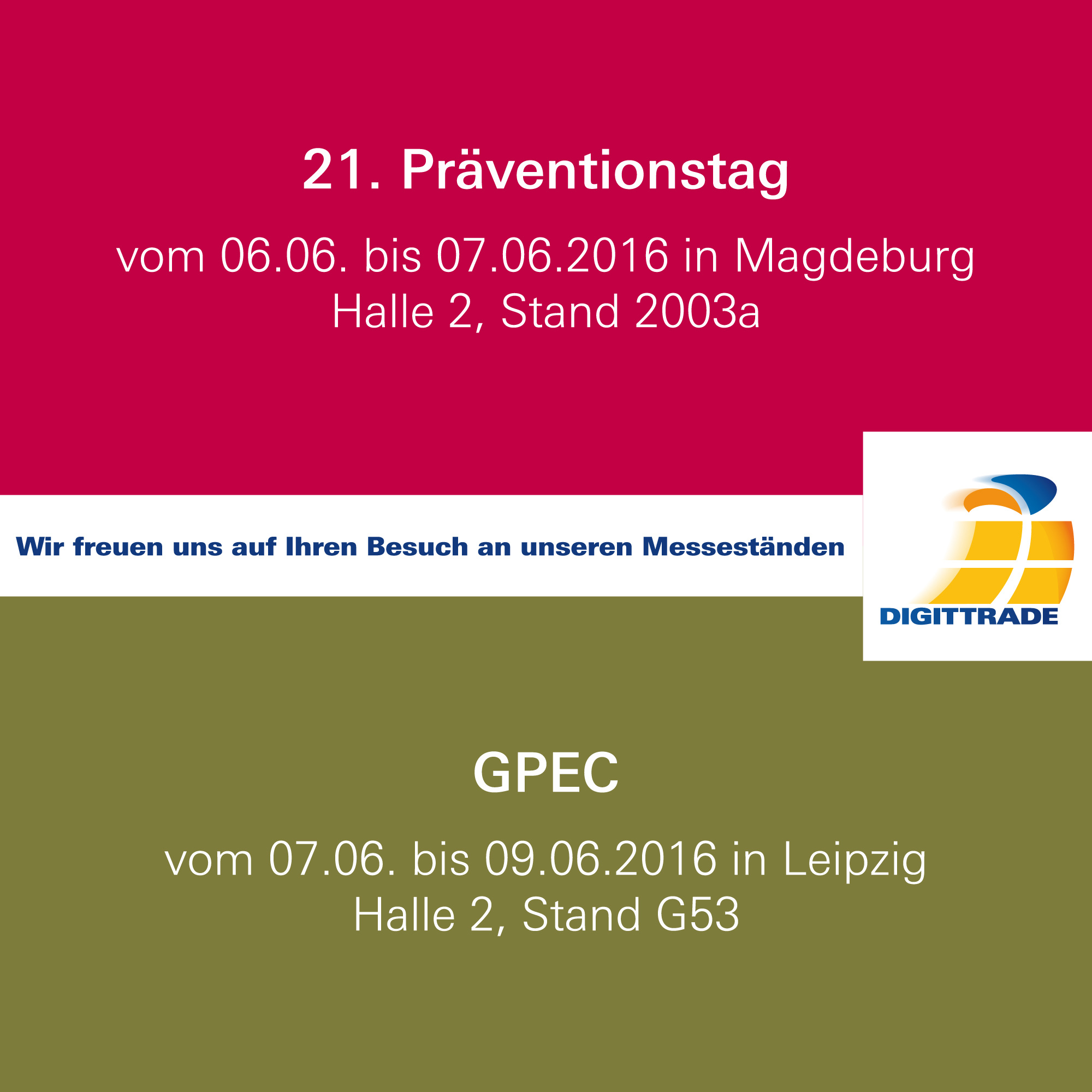 Zum 21. Präventionstag in Magdeburg sowie zur GPEC in Leipzig präsentiert DIGITTRADE die datenschutzkonformen IT-Sicherheitslösungen Chiffry und die Hardware verschlüsselten Festplatten den Veranstaltungsbesuchern.